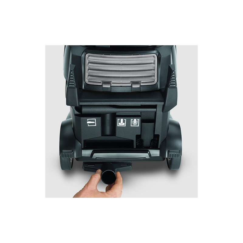 Aparatul extrem de silentios combina confortul ergonomic superior datorita integrarii complete a furtunului de aspiratie, cablului de alimentare si accesoriilor, precum si doua pozitii de oprire pentru duza de podea, cu performante de aspirare excelente si o raza de actiune foarte extinsa.