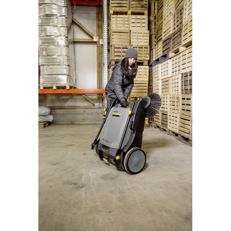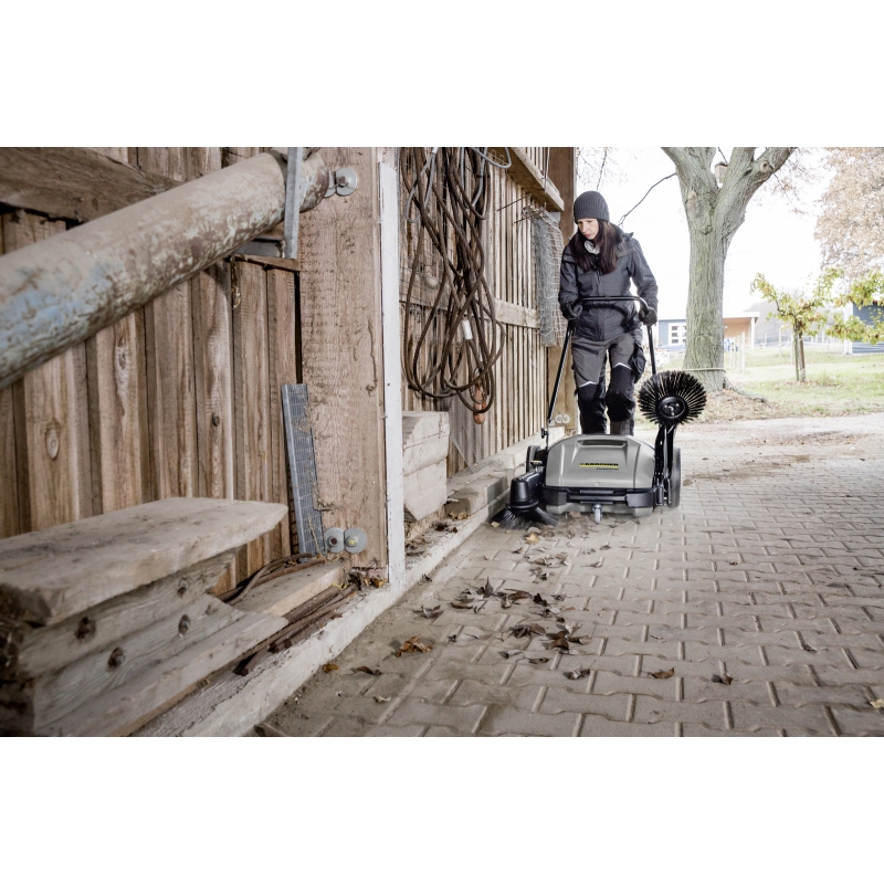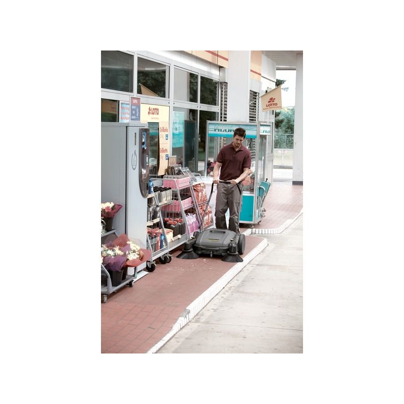 Masina de maturat manuala pentru curatarea usoara si comoda a zonelor exterioare. De sase ori mai rapida decat o matura obisnuita. Maturare aproape complet fara praf prin controlul fluxului de aer si cu ajutorul filtrului de praf fin. Peria rola este reglabila pe inaltime si deci adaptabila in functie de suprafete. Peria rola este ghidata de ambele roti. Manerul telescopic se regleaza pe inaltime in functie de utilizator si poate fi pliat complet pentru a economisi spatiu de depozitare. Aparatul este dotat standard cu doua perii laterale.
