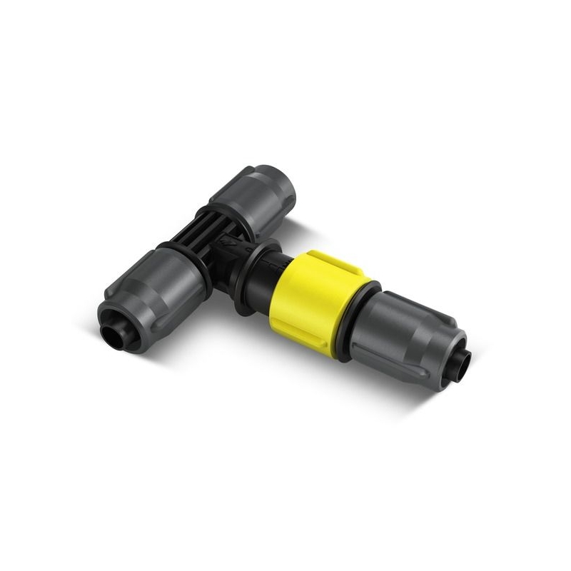 Piesa in T cu posibilitate de reglare conecteaza 3 furtunuri Kärcher Rain System® si furtunuri de absorbtie. Teul lateral este reglabil si este perfect pentru racordarea furtunului de absorbtie.