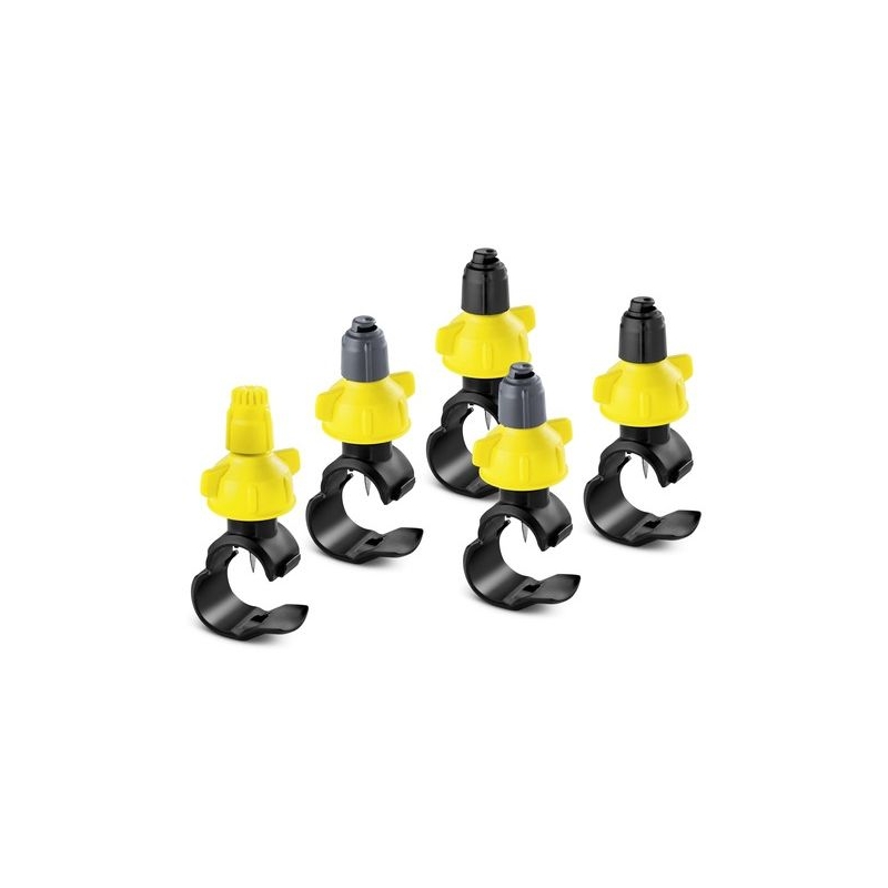 Colierele de pulverizare sunt parte a "Karcher Rain System®". Acestea pot fi fixate rapid in orice moment la furtunul Karcher Rain System®. Instalarea este rapida, simpla si nu necesita instrumente. Acul integrat de pe colierul deschis de pulverizare este pur si simplu blocat in furtun. Prin inchidere, colierul de pulverizare este fixat in mod sigur de furtun. Alinierea unghiului de pulverizare poate fi ajustata orizontal si vertical datorita capului rotativ. Pe duza, volumul de apa poate fi ajustat de la 0-55 l/h conform cerintelor si pentru a conserva resursele. Deosenit de eficient Karcher Rain System® cu presiune de 4 bari contine un furtun de 1/2" cu picurare si coliere de pulverizare si combina avantajele micro-picurarii si ale irigarii conventionale. Karcher Rain System® poate fi adaptat individual la orice gradina si lucreaza perfect cu SensoTimer pentru controlul irigarii in functie de necesitati.